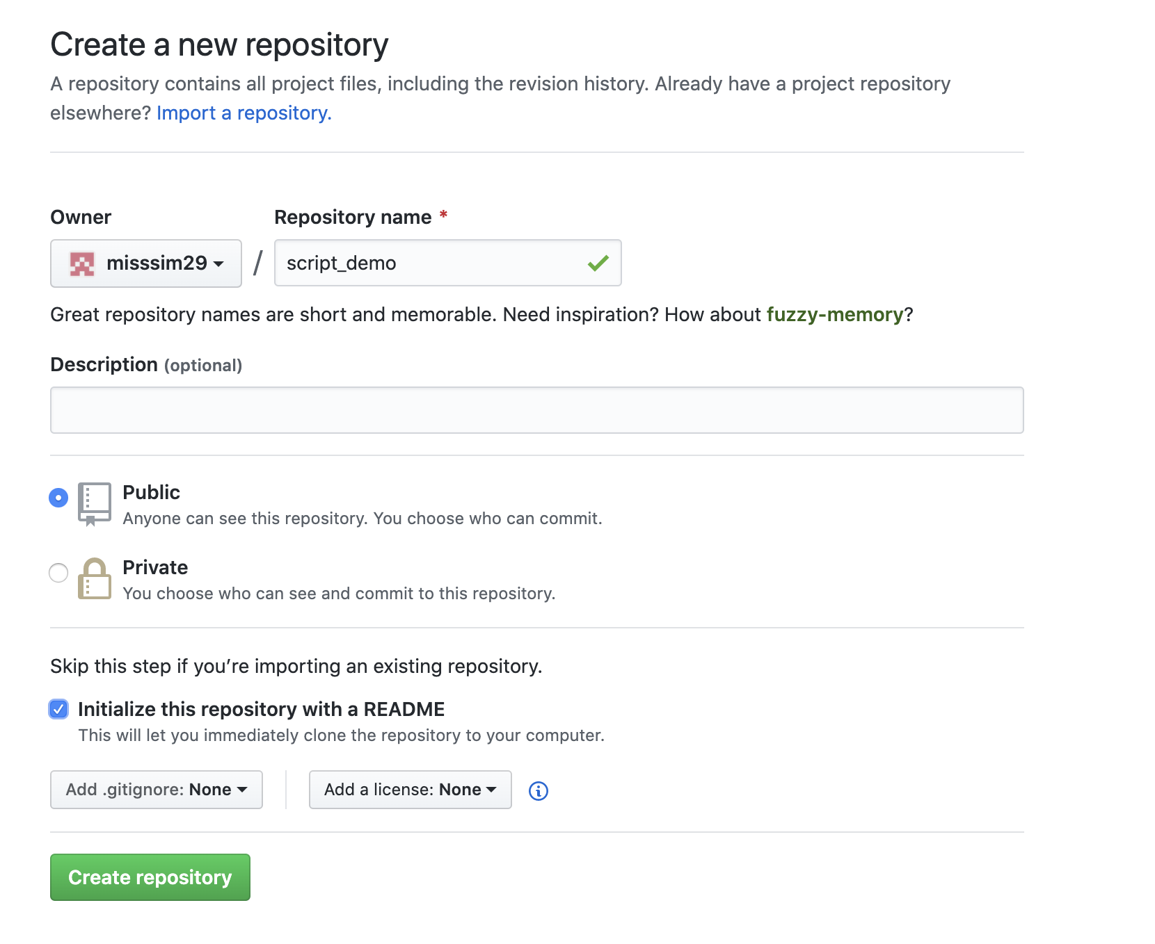 주소를 쓰고, public 에 체크가 되어있는지 확인 후 아래 Initialize this repository with a README를 체크해준다.