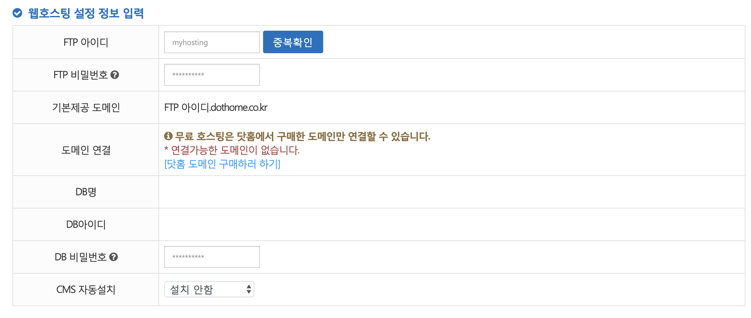 무료호스팅을 신청하면 세부 설정화면이 뜬다. 담당자정보, 계약자 정보, 웹 호스팅 설정 정보 등을 입력하는데