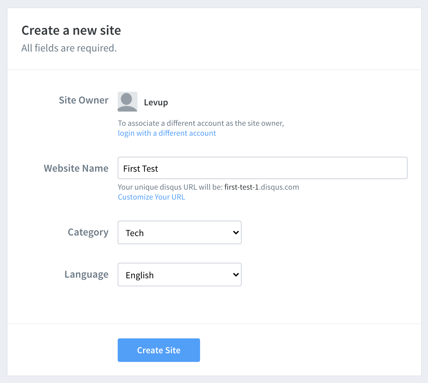 이름과 카테고리를 원하는대로 설정해준 후 Create Site