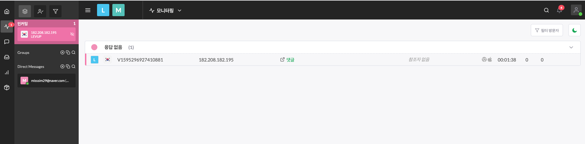 Tawk의 관리자페이지에 전화벨소리가 울리며 알림이 뜬다. 왼쪽 바이탈모양에 들어가보면 채팅이 걸려와있는데