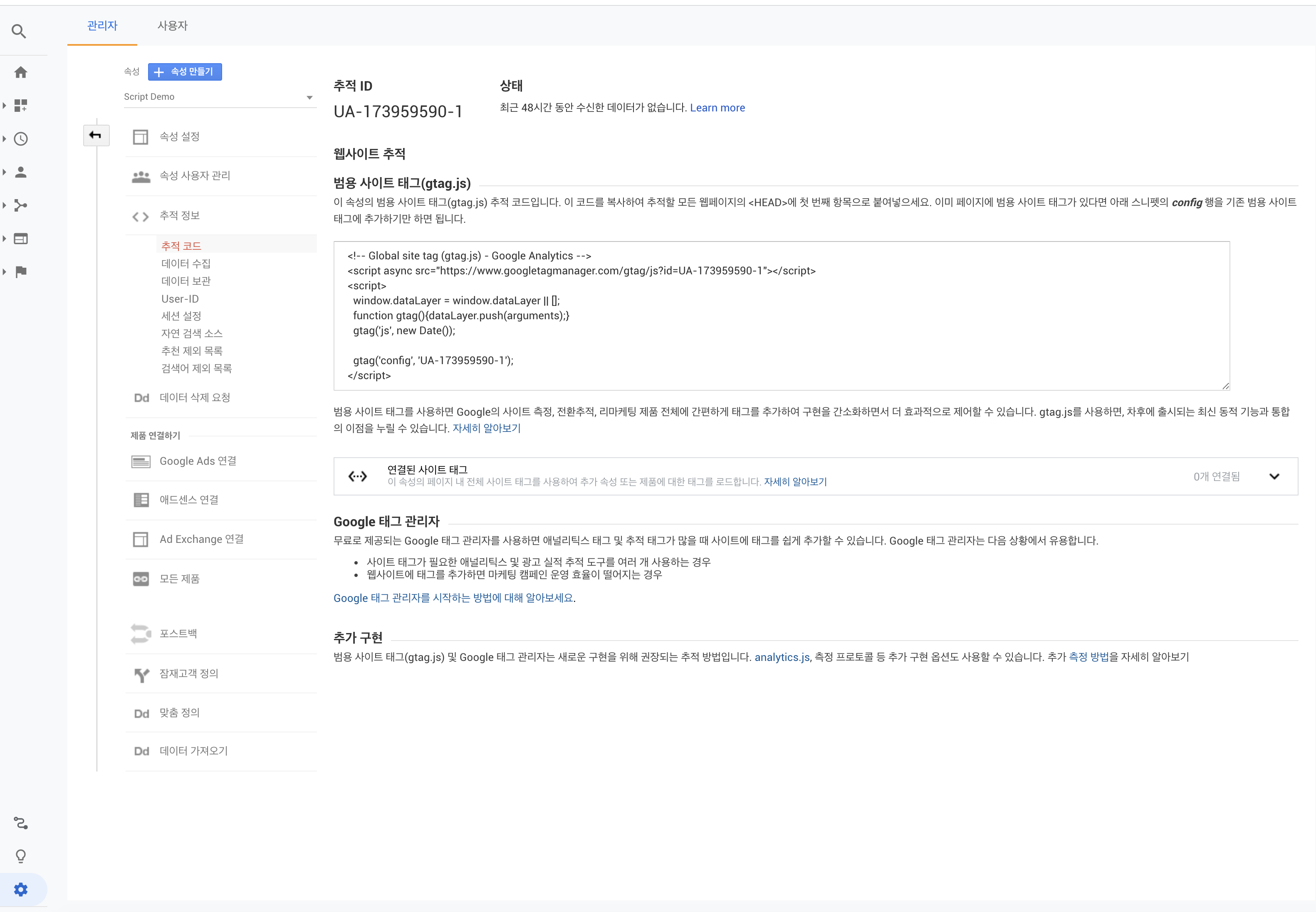 추적 코드 (tracking code)에 들어가서 적혀있는 스크립트 코드를 내 웹페이지의 head 태그 안에 넣어준다.