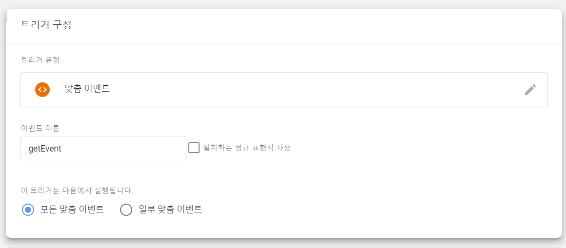트리거 구성은 맞춤 이벤트로 해서 이벤트 이름을 설정해주는데 설정한 이벤트는 주고자 하는 이벤트쪽에