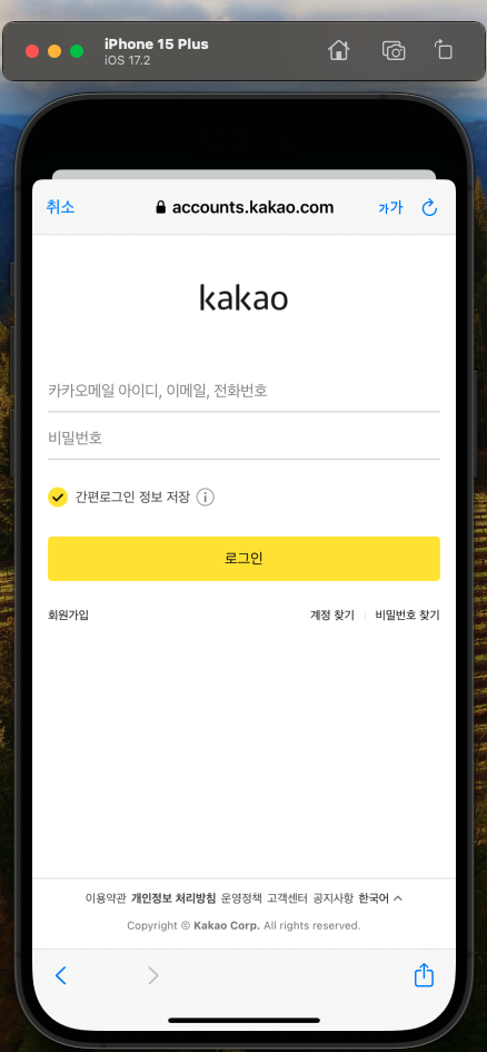에뮬레이터는 카톡이 설치 안되있어서 웹버전 카카오로그인화면으로 넘어간다(디바이스에선 카카오로 바로 연동된다)